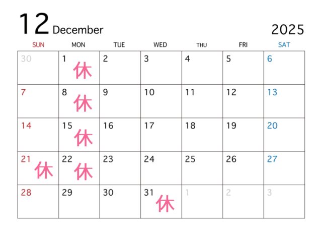 2025.11.09 お知らせ 12月のお休み いつもジョリレーヌをご利用いただきありがとうございます❣ 12月のお休みのお知らせです☆ 29日の月曜日は営業となります☺ 31日~1月3日までお正月休みとなりますのでよろしくお願いします☆ <一覧へ>